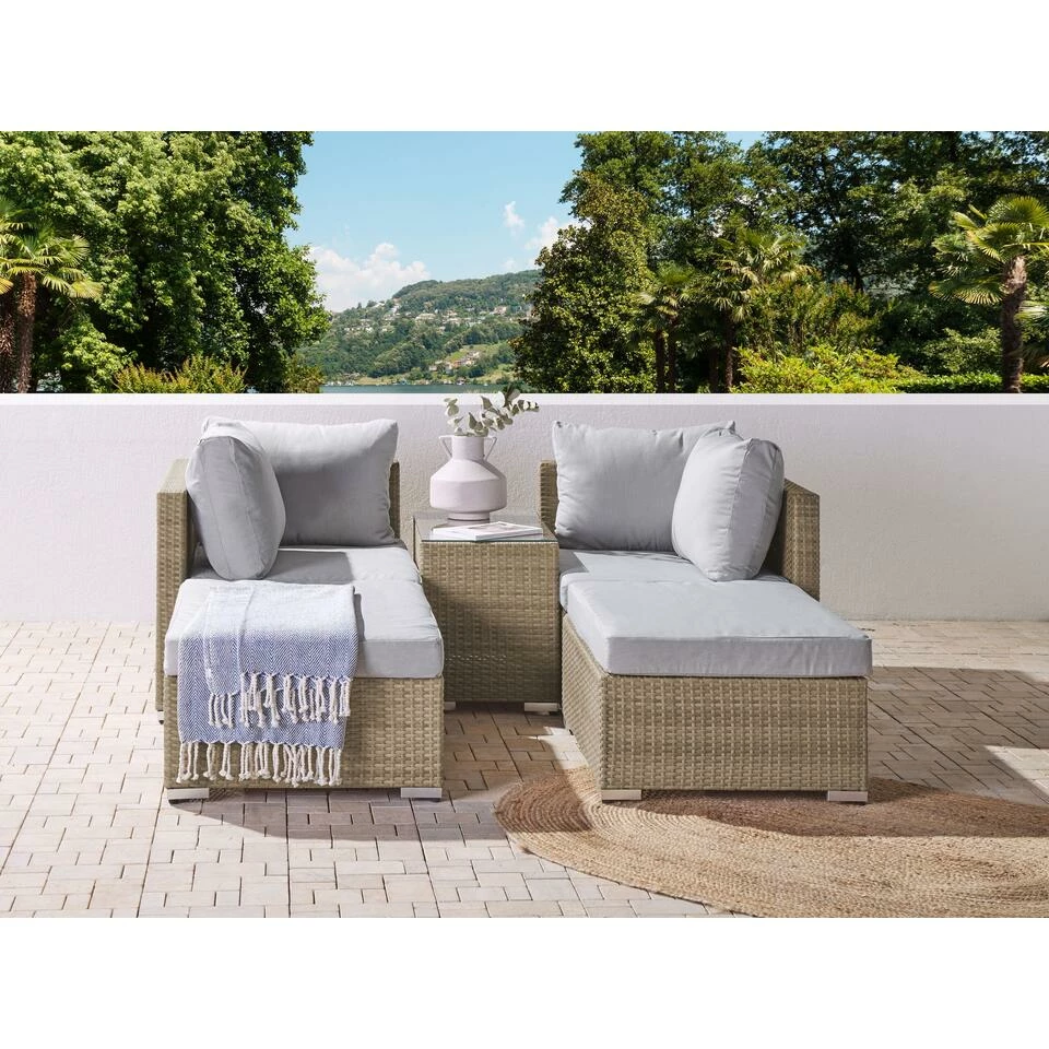 Tekst weerstand: Dit product bestaat uit UV-bestendige stof. Dit betekent dat het veilig gebruikt kan worden in zonlicht zonder kleurvervaging. We raden je wel aan het product onder een beschermhoes te bewaren wanneer het niet in gebruik is. Zo gaan de meubels langer mee.