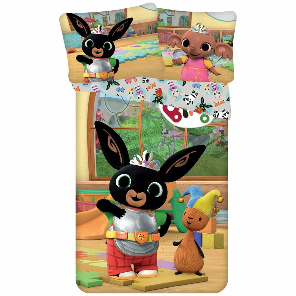 Bing Bunny dekbedovertrek, Flop en Sula. Leuk katoenen dekbedovertrek van Bing Bunny met vriendjes Flop en Sula. De achterzijde van dit overtrek heeft een contrasterende print met nog meer vriendjes van deze gezellige serie, zodat het overtrek ook omgekeerd op het bed gelegd kan worden.
