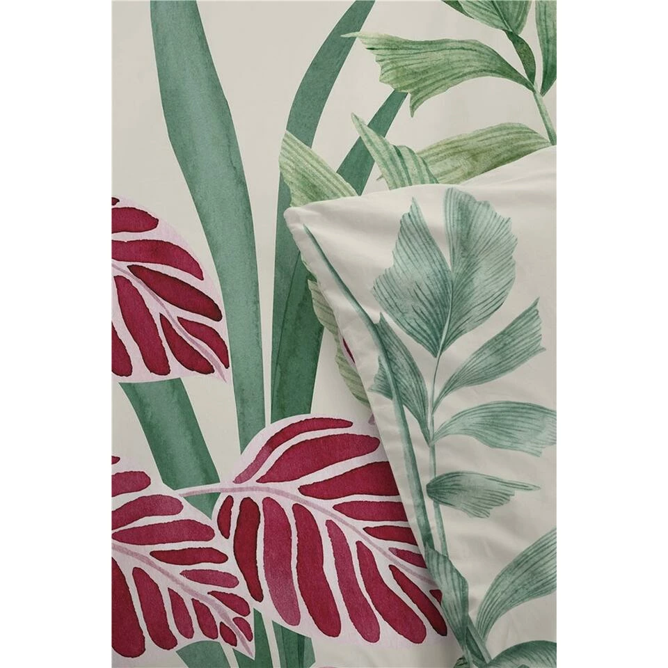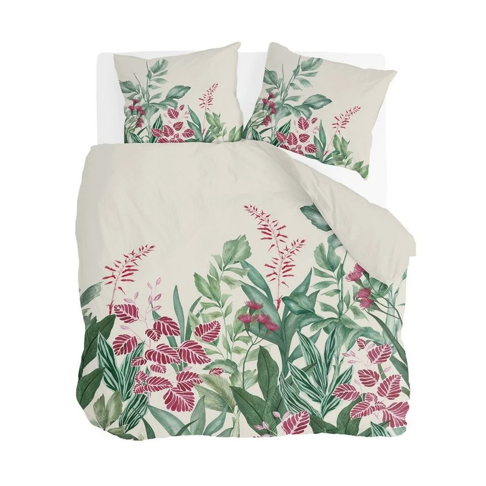 Pak je slaap onder dit sfeervolle dekbedovertrek. Door de combinatie van groen, diep roze en de rustige off white ondergrond een sfeervolle toevoeging in je slaapkamer. Gemaakt van 100% katoen, een natuurlijk materiaal dat ademt en vocht reguleert.