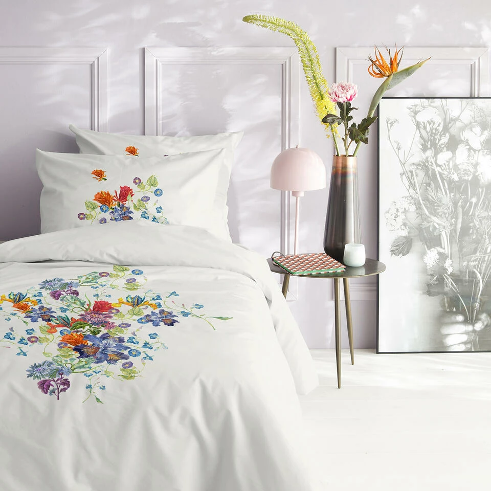 Laat de slaapkamer weer opleven en breng frisheid in de kamer met het dekbedovertrek Iris van Cinderella. Het overtrek heeft een dessin van aquarel geschilderde bloemen in rijkelijke kleuren. De witte ondergrond maakt dit dessin extra krachtig