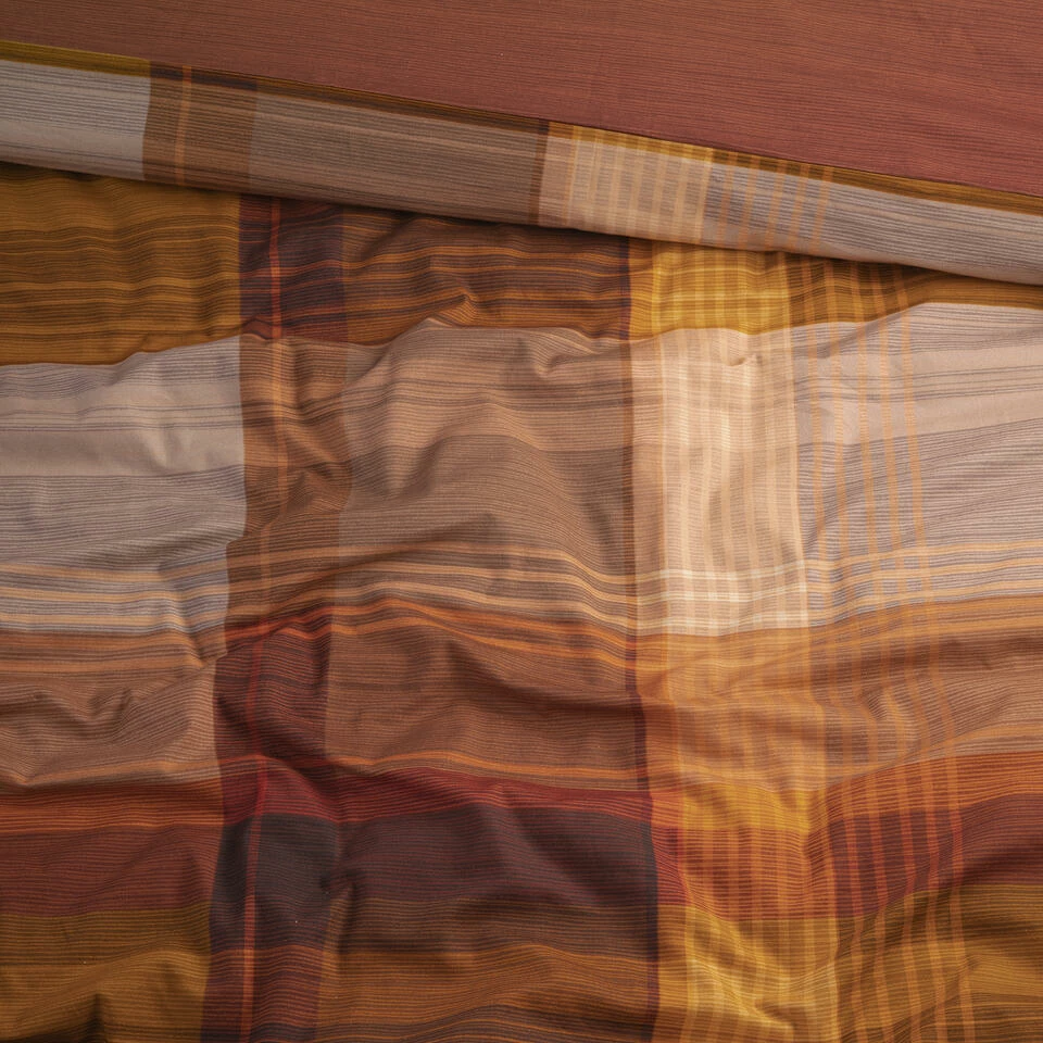 Het Ponte dekbedovertrek van Cinderella heeft een tijdloze ruitenprint uitgevoerd in warme kleuren, van aarderood tot okergeel waarmee je warmte en gezelligheid creëert in de slaapkamer. Het overtrek heeft een double-face ontwerp met op de achterzijde een effen print met een subtiel effect van een ribstructuur.