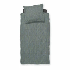 Het dekbedovertrek Flode van Damai bestaat uit een ontwerp van een bijzonder patroon waarbij onregelmatig strepen verticaal zijn doorgetrokken in verschillende kleuren. Vloeiende lijnen dat als water over het dekbedovertrek stroomt. Het geheel straalt iets rustgevends uit en in combinatie met de kleuren ‘Salvia Green’ of ‘Steel Blue’ is dit de sfeer waar we naar op zoek zijn in de slaapkamer.
