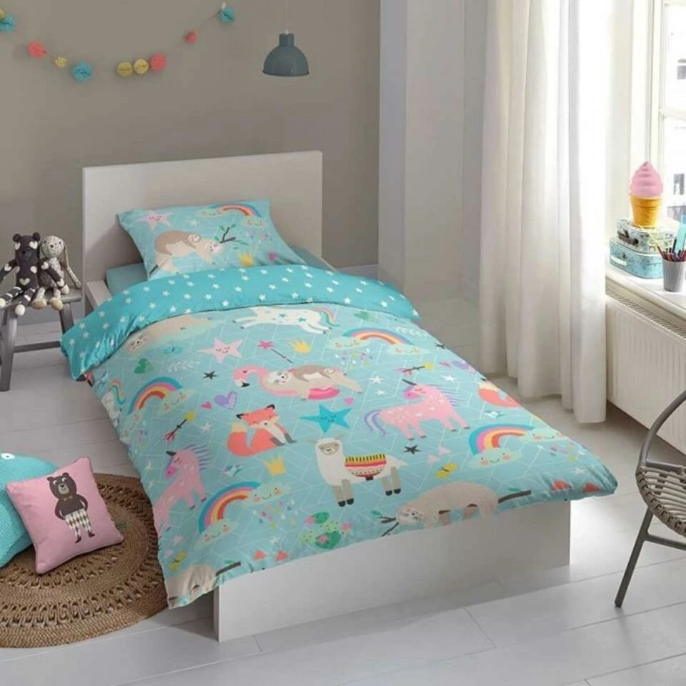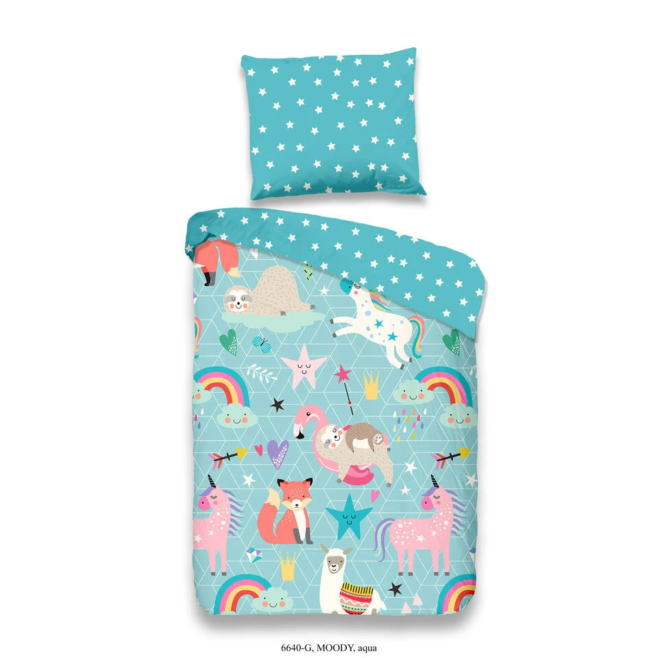 Dekbedovertrek “Moody” van Good Morning met dieren en regenbogen, in de kleur “Aqua” is gemaakt van 100% Cotton. Deze kwaliteit is ademend, vocht absorberend en voelt zacht en soepel aan.