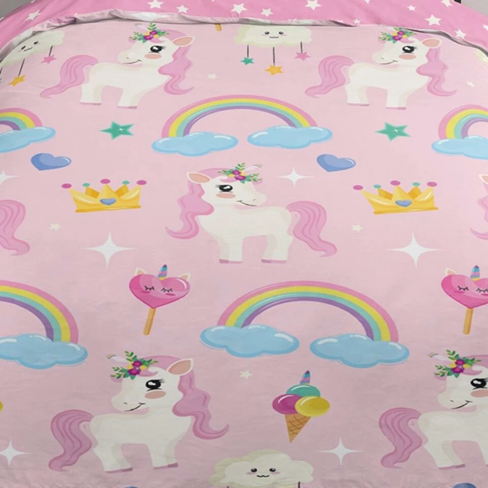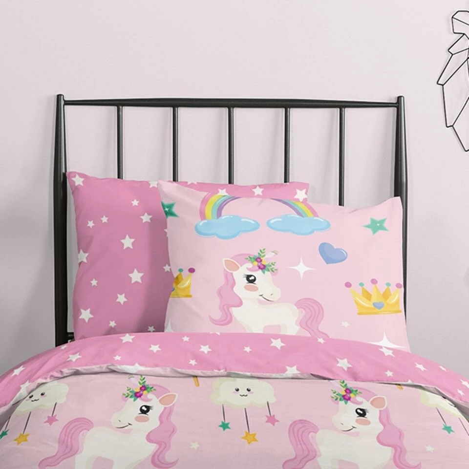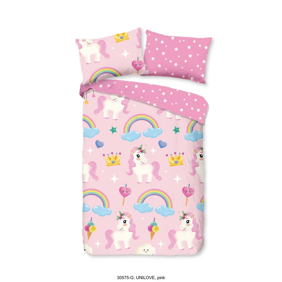 Dekbedovertrek “Unilove” van Good Morning met eenhoorn, in de kleur “Roze” is gemaakt van 100% Cotton. Deze kwaliteit is ademend, vocht absorberend en voelt zacht en soepel aan.