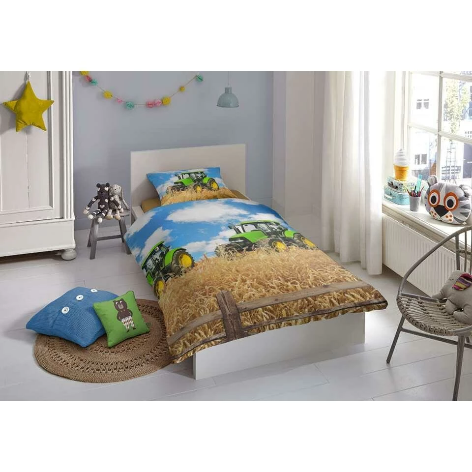 Op dit multicolor kinderdekbedovertrek staat een groene tractor afgebeeld. Dit dekbedovertrek is een aanvulling voor de kinderslaapkamer! En doordat het dekbedovertrek van 100% katoen is, slaap jew kind hier ook nog eens heerlijk onder.