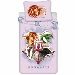 Harry Potter Dekbedovertrek, Hogwarts. Een mooi katoenen dekbedovertrek met het logo van Zweinstein, de bekende tovenaarsschool uit de Harry Potter filmreeks. Op de achterkant staat een herhalend patroon van dit logo en op het extra grote kussensloop staat het leeuwenhoofd van Gryffindor. Een leuk cadeau idee voor de feestdagen of een verjaardag voor een Harry Potter fan!