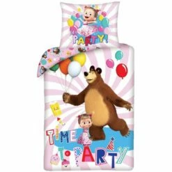 Masha en de Beer Dekbedovertrek, Party. Tijd voor een feestje! Masha en de beer hebben de grootste lol met hun ballonnen op dit partijtje. Wie zal er jarig zijn? Is het Masha of de beer? Op de achterkant staat een contrasterend dessin wat het geheel een leuk effect geeft. Eventueel tweezijdig te gebruiken, daardoor. Dit katoenen dekbedovertrek wordt geleverd in een leuk, bijpassend, tasje en een extra groot kussensloop.