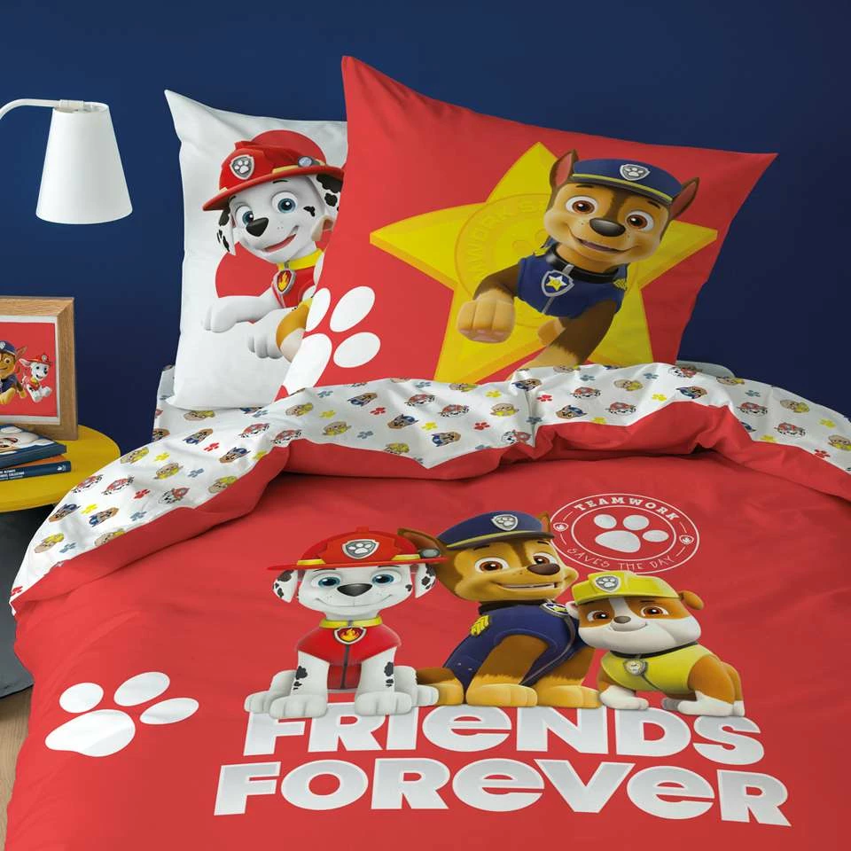 Paw Patrol Dekbedovertrek, Trio. Mooi katoenen eenpersoons dekbedovertrek van Paw Patrol met de vrienden Chase, Marshall en Rubble op de voorzijde. De achterzijde heeft een all over print met kleine hoofdjes van drie vrienden en voetstappen.