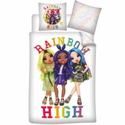 Rainbow High Dekbedovertrek Pose. Stoer polyester dekbedovertrek met de meiden van Rainbow High. Gekleed volgens de laatste mode staan deze fashionista’s in een leuke pose op deze mooie set. Zowel de overtrek als het kussensloop zijn dubbelzijdig bedrukt, wat leuke mogelijkheden geeft bij het opmaken van het bed. Een waanzinnig tof cadeau voor iedereen die gek is op mode en op Rainbow High. Ideaal voor een verjaardag of de feestdagen!