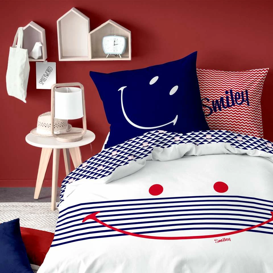Smiley Dekbedovertrek, Marine. Mooi eenpersoons katoenen dekbedovertrek met een gave druk van een smiley met een streepjespatroon. De rode en blauwe kleur complimenteren elkaar mooi, dit prachtige dekbedovertrek is ook een fantastisch cadeau.
