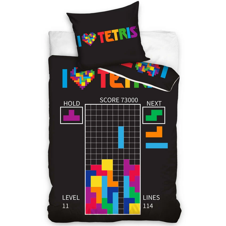 Tetris Dekbedovertrek. Geweldig katoenen dekbedovertrek van het beroemde Tetris spelletje. Nu kan je zelfs in je dromen dit spel nog spelen onder dit gave dekbed. Zo kan je altijd die High Score halen! Wordt geleverd inclusief groot kussensloop, voor dat extra opvallende effect in jouw slaapkamer. Een geweldig cadeau voor een verjaardag of feestdagen voor de echte game-fan!